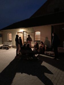 Being located at a barely heated former grange, the public program needed to provide plenty of possibilities to get warm. Hence for the next activities, we split up in three groups and prepared the place for the evening program while having the chance to exchange in a more informal way. The first group made the outside space cosy by making a bonfire, the second group set up the space for a movie screening and the third group was in charge of providing food. At a certain point, the bright red handcarts carrying loudspeakers were being rolled over the field from the barn towards the site, the goulash – a poem! – was simmering on the electro stove behind tarnished windows, while the jackets of some participants slowly absorbed the smell of the fire. Once everything was set up, we enjoyed dinner and a movie: Hot water bottles and blankets kept us warm from the outside, food and tea from the inside. The screening showed “Sonne” by Kurdwin Ayub (Austria, 2022), a movie that revolves around three teenage women in Austria and deals with topics such as friendship, belonging and religion.